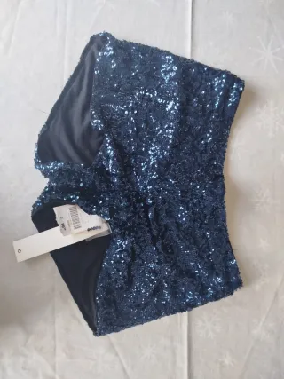 Shorts de fiesta y bolso a juego de lentejuelas azul marino. Si precio original eran 19'90€ cada uno como se puede apreciar en las etiquetas. - Diseño de lentejuelas brillantes. - Forro interior tela negra.