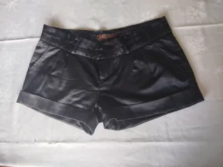 Shorts de fiesta en raso negro. Ideales para eventos especiales. - Tejido satinado. - Bolsillos laterales. - Dobladillo en el bajo.