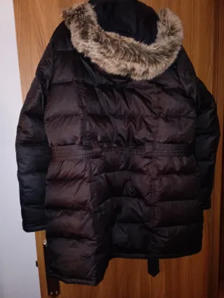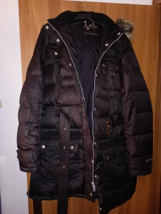 Elegante chaquetón largo para mujer plumas sólo le falta el tirador de la cremallera pero la cremallera funciona perfectamente,mirar fotos. - Diseño acolchado. - Cinturón a juego. - Capucha con pelo. - Bolsillos frontales.
