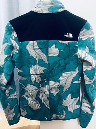 Polar The North Face de mujer con un diseño llamativo. - Mangas y cuello con estampado de hojas en verde y blanco. - Paneles frontales y traseros en negro. - Cremallera central. - Bolsillo con cremallera en el pecho.