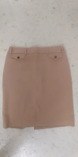 Falda de mujer de la marca Kihara en color beige. Diseño elegante y versátil. - Dos bolsillos frontales falsos con botón. - Cintura con trabillas para cinturón. Cremallera trasera.
