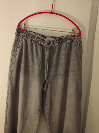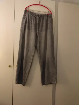 Pantalón vaquero de mujer con un diseño de pierna ancha. - Color gris - Cintura con cordón ajustable - Bolsillos laterales