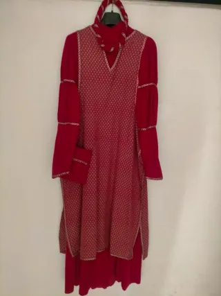 Traje de estilo medieval en buen estado. Presenta un diseño con cuello alto y detalles trenzados en los hombros. - Tejido con acabado brillante. - Mangas largas. - Falda amplia.