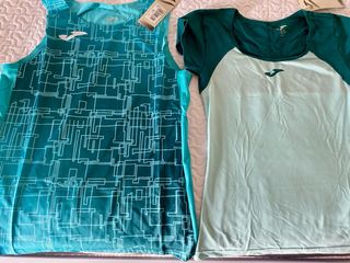 NO REBAJO, NO HAGAIS OFERTA están nuevas y sin estrenar!! Conjunto de dos camisetas deportivas técnicas para mujer, talla S. Ambas son nuevas y de la marca Joma. - Camiseta sin mangas con estampado geométrico en tonos turquesa. - Camiseta de manga corta raglán en dos tonos de verde. #deporte #running #mujer #tallas #s
