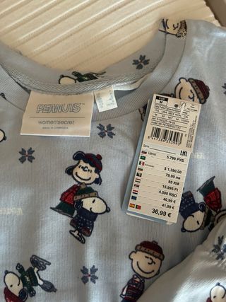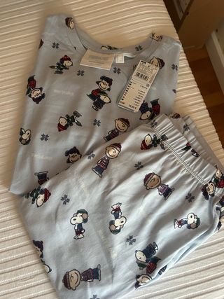 Conjunto de pijama de manga larga y pantalón largo con estampado de personajes de Peanuts. - Estampado de invierno con Snoopy y otros personajes. - Tejido suave y cómodo. - Cintura elástica en el pantalón. Pijama azul con estampado de Snoopy. Súper suave y cómodo. Talla M. Marca Women’secret. Nuevo con etiqueta