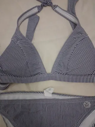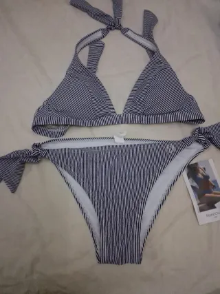 Bikini de dos piezas con un diseño de rayas verticales en azul marino y blanco. El top es de estilo halter con tiras anudables en el cuello y la espalda. La braguita tiene tiras laterales para anudar. SIN ESTRENAR, UNA PRECIOSIDAD - Diseño de rayas verticales. - Tirantes anudables en top y braguita.