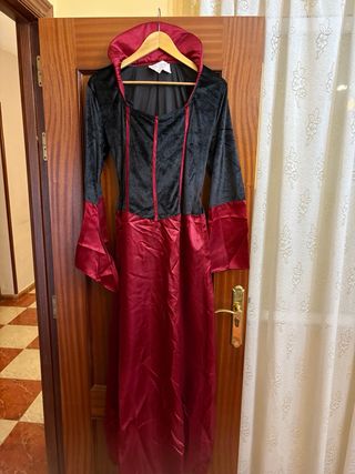 Disfraz de vampiresa con un diseño elegante y llamativo. - Diseño de dos piezas en negro y rojo. - Mangas acampanadas con detalle satinado. - Cuello alto con volantes. - Ideal para fiestas temáticas o Halloween.