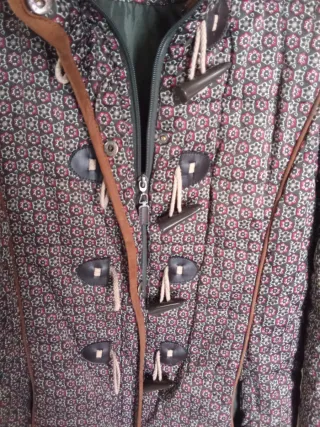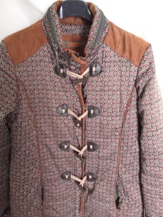 Chaqueta con un diseño original y llamativo. - Estampado floral en tonos marrones y rojizos. - Detalles en ante en los hombros. - Cierre de cordones y botones de madera. - Cuello alto con cremallera.