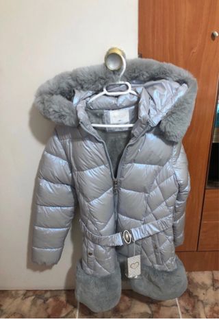 Chaqueta de invierno plateada con detalles de pelo. - Capucha con pelo sintético. - Cinturón ajustable. - Puños y bajo con pelo sintético.