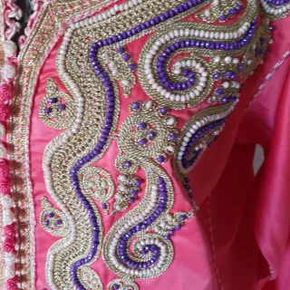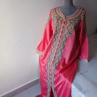 Preciosa takchita vintage con bordados florales. - Talla L/XL. - Diseño con bordados en tonos rosas y morados. - Manga larga. - Cierre frontal con detalles. - Largo hasta los tobillos.