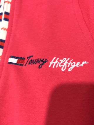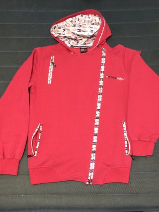 Sudadera con capucha de Tommy Hilfiger en color rojo. Presenta un diseño moderno con cremallera asimétrica y detalles en el forro interior. - Cremallera frontal asimétrica. - Bolsillos laterales con cremallera. - Forro interior con estampado de logo. - Puños y bajo elásticos.
