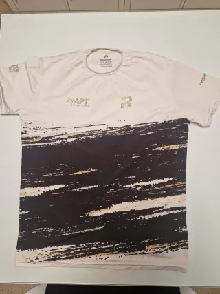 Camiseta de pádel con un diseño moderno y llamativo. - Diseño con salpicaduras en negro, blanco y detalles dorados. - Logo de APT Padel Tour en la parte frontal. - Inscripción 'royal' en la manga derecha.