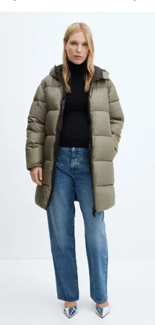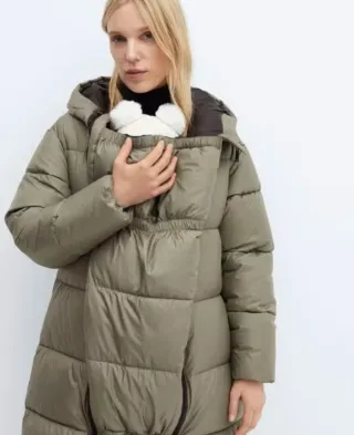 Abrigo de porteo de la marca Mango, perfecto para llevar al bebé contigo de forma cómoda y abrigada. Parte delanteta extraible para convertirlo en abrigo de mujer normal. En perfecto estado, usado solo 3 veces - Diseño acolchado. - Capucha integrada. - Cierre frontal.