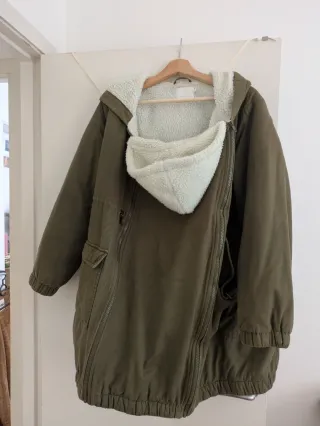 Abrigo de porteo: - Con forro muy calentito. Perfecto para el invierno. - Cierre frontal con cremallera y botones - Cordones ajustables. Un abrigo práctico que te permite llevar a tu bebé contigo de forma cómoda y segura. !En perfecto estado!