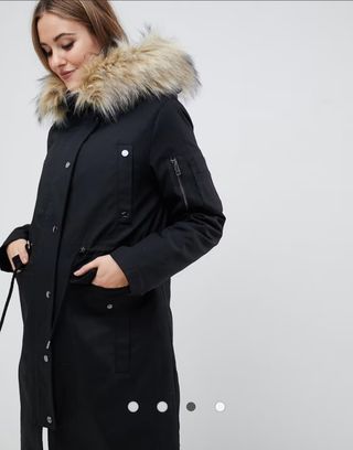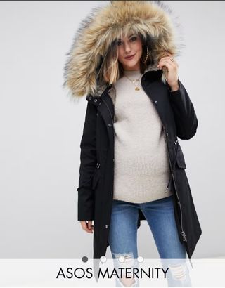 Parka con forro de pelo sintético de quita y pon de ASOS Maternity. En color negro. Talla 42. Da bastante talla. Es muy abrigadita y se recoge la cintura para poder seguir usando después del parto. Precio original 85€. No tiene mucho uso, está en perfecto estado.