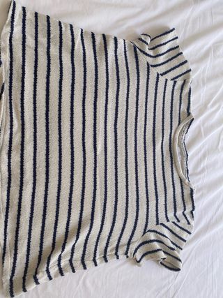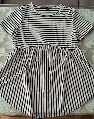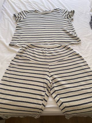 Preciosa y cómoda ropa de maternidad de verano. Ideal para esos días calurosos. Consta de camiseta (talla M) y pantalón (talla L). Es de Lefties. Sin uso apenas, porque ha nacido la peque antes de que llegara el calor. Muy ligero y ancho, cómodo para los dias de calor. - Conjunto de dos piezas: top y pantalón. - Rayas azul marino y beige. - Tejido suave y ligero.