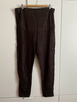 Leggings premamá color marrón chocolate efecto cuero, marca Alia de la talla XL, con corchetes ajustables.