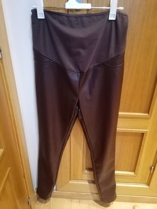 Pantalón premamá, de pitillo y polipiel, de color marrón