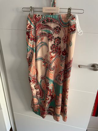 Conjunto premamá con un diseño vibrante y colorido. - Estampado paisley llamativo. - Tirantes finos. - Largo midi.