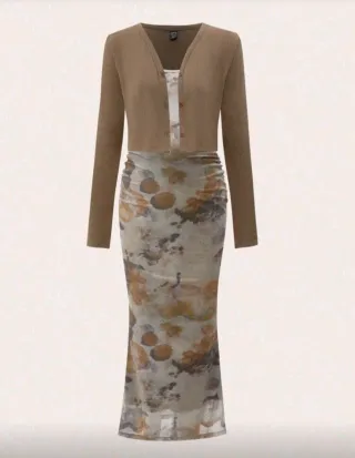 Conjunto de dos piezas para premamá, ideal para lucir cómoda y a la moda. - Chasueta corta de punto fino en color marrón. - Vestido largo de tejido semitransparente con estampado abstracto. - Diseño ajustado y fruncido en el vestido. Sienta genial y es elástico. Para verano e invierno. Usado pero como nuevo