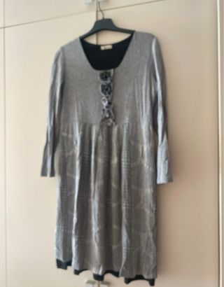 Conjunto de tres piezas de ropa premamá en tallas grandes. Ideal para esta etapa. - Chaqueta de cuadros en blanco y negro. - Vestido de punto verde con capucha. - Vestido marrón de manga larga.