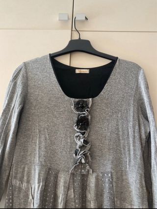 Vestido premamá de manga larga en color gris. Presenta un diseño con detalle de volantes en la parte delantera. - Tejido suave y cómodo. - Largo hasta la rodilla. - Escote redondo.