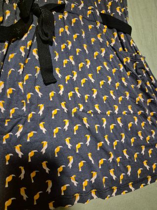 Vestido premamá con un bonito estampado de pájaros en tonos grises y amarillos. Es cómodo y favorecedor. - media manga - Cintura ajustable con lazada negra. - Cuello en V. - Bolsillos