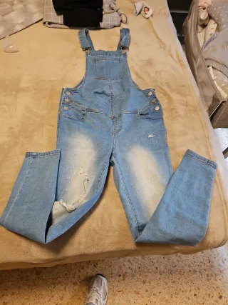 Peto vaquero diseñado para embarazadas. Cómodo y práctico para el día a día. - Tejido vaquero resistente. - Diseño con peto y tirantes. - Bolsillo frontal con detalle de cuadros.