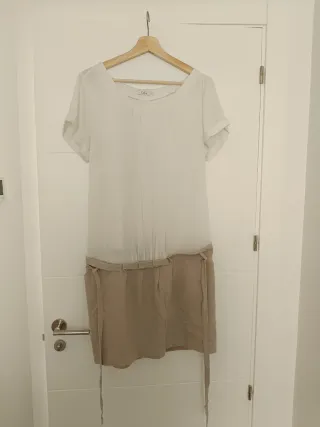 Vestido premamá de dos tonos, blanco en la parte superior y beige en la inferior. - Diseño con cuello redondo. - Mangas cortas. - Cintura marcada con cintas para anudar.