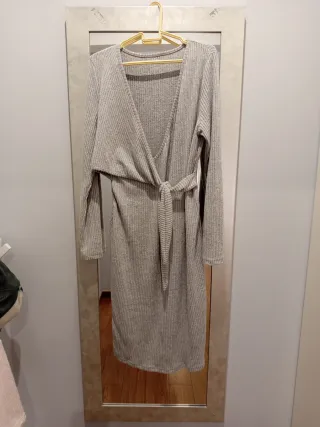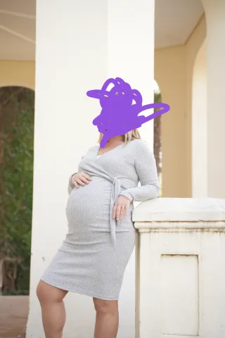 Vestido de punto para premamá, ideal para el embarazo. Su diseño cruzado se ajusta cómodamente a la figura. - Tejido de canalé suave. - Cinturón para anudar a la cintura. - Manga larga.