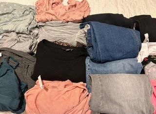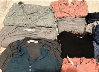 Lote de ropa de maternidad en talla M. Incluye varias prendas cómodas y funcionales para el embarazo. - Prendas de vestir en tonos negros y grises. - Talla M (equivalente a 38/10). -2 vaqueros uno azul y otro negro de H&M -2 sueters de H&M -1 Sueter largo tipo vestido -1 mallas de deporte