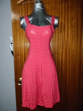 Vestido corto de verano con un estampado floral. - Diseño con tirantes. - Por encima de la rodilla. - Estampado de pequeñas flores blancas sobre fondo rojo. - Sin estrenar con la etiqueta puesta