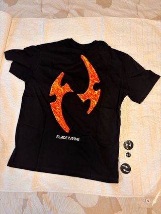 Camiseta negra de la marca Blade Divine. Solo 100 camisetas de esta edicion. Talla M sin estrenar Regalos 3 pegatinas, una con relieve. - Diseño con estampado de llamas. - Logo de la marca en la parte inferior.