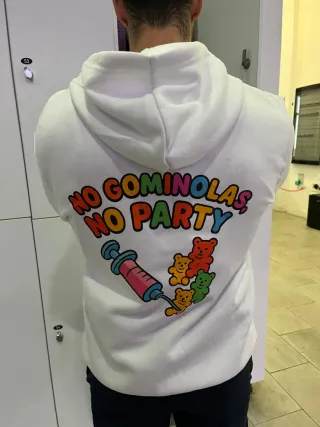 Sudadera con estampado divertido. - Diseño No Gominolas, No Party. - Ilustración de jeringuilla y ositos de gominola. - Color blanco. Nueva a estrenar