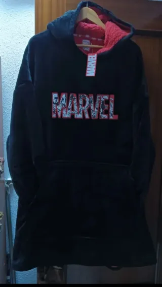 Confortable bata manta con licencia oficial de Marvel. Perfecta para estar cómodo en casa. - Diseño reversible con interior sherpa. - Bolsillo frontal grande. - Capucha integrada. Está sin estrenar nueva, si te gustan los superhéroes esto es para tí,la puedes ver sin compromiso,es muy calentita ,para estos días de frío te vendrá genial