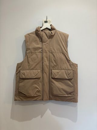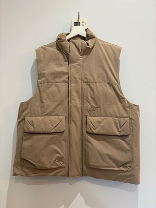 Chaleco acolchado de la marca Nike en color beige. Es una prenda versátil y cómoda. Talla: M. Tecnología therma-fit. Sin estrenar. - Diseño sin mangas. - Cierre frontal. - Bolsillos en la parte delantera.