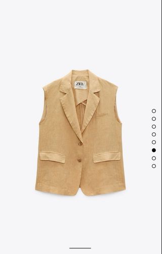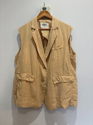 Chaleco de lino de Zara Studio, ideal para un look elegante y fresco. Talla: XS/S pero equivale a M. Sin estrenar, con etiqueta. PVP: 69,99€. - Diseño sin mangas. - Cierre de un botón. - Bolsillos frontales.