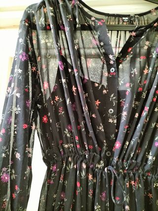 Vestido tipo vaporoso (100% poliéster), fondo negro y florecitas, largo midi; cintura con cordoncito ajustable; forro interior fino quita/pon. Marca UNIQLO, TALLA S (**corresponde a 38 completa, o 40). Nuevo, sin estrenar.