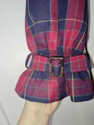 Gabardina con estampado tartán en tonos azul marino y burdeos. Talla L, sin estrenar. Confección de mucha calidad, comprada en tienda Clem, forrada, un capricho de bonita. - Cuello de solapa. - Cierre cruzado con botones. - Cinturón a juego. - Puños con volante.