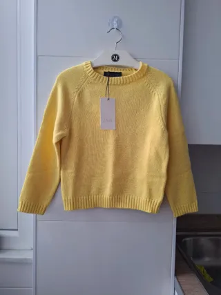 Jersey de punto básico de color amarillo sin estrenar. No tiene ningún desperfecto. Cuello redondo y manga larga. Acabados de cuello, puños y bajos en rib (canalé) a tono. Confeccionado en hilatura con cashmere 6%. Medidas: - Pecho: 42,5 cm - Largo: 50,5 cm - Largo manga: 56,5 cm - Ancho espalda: 41 cm - Ancho brazo: 16,5 cm Talla S (36) mujer, Zara. Precio original tienda: 25,95€ Envíos rápidos. Descuento por lote activo. #Zara #JerseyPunto #AmarilloPastel #Knitwear #ZaraWoman #BasicKnit #JerseyAmarillo #ModaSostenible #CashmereBlend