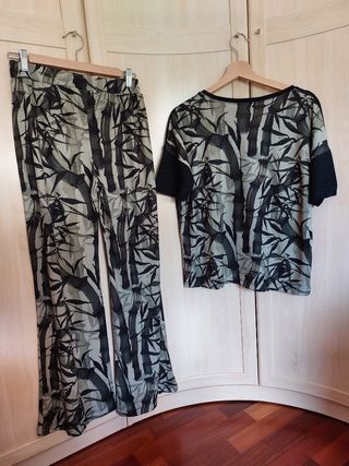 Conjunto de camiseta y pantalón estampado, con etiqueta, sin estrenar. 94% poliester y 6% elastomero.