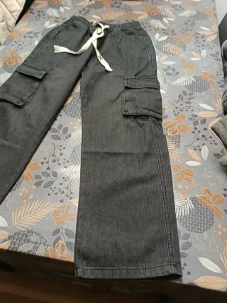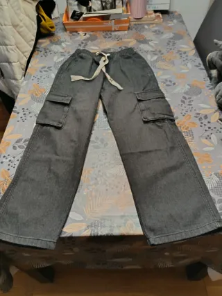Pantalón vaquero de corte ancho, ideal para un estilo cómodo y moderno. NUEVO SIN ESTRENAR - Cintura con cordón ajustable. - Bolsillos laterales y en los muslos. - Tejido vaquero resistente. - Pone una M en la etiqueta pero son pequeños serían como una talla 12-13 aprox 155cm. - Tejido no elástico.
