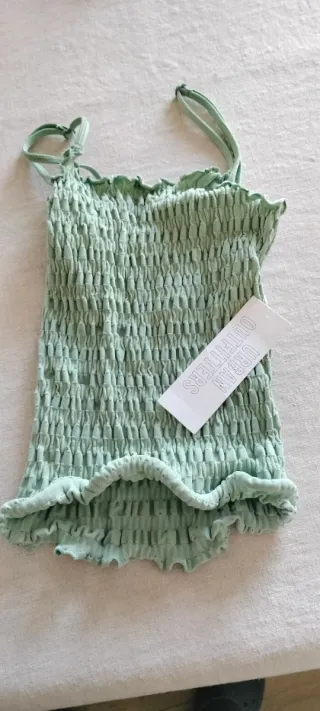 Top de tirantes con un diseño fruncido muy favorecedor. - Tejido elástico y cómodo. - Detalle de volantes en el bajo. - Sin estrenar, con etiqueta.