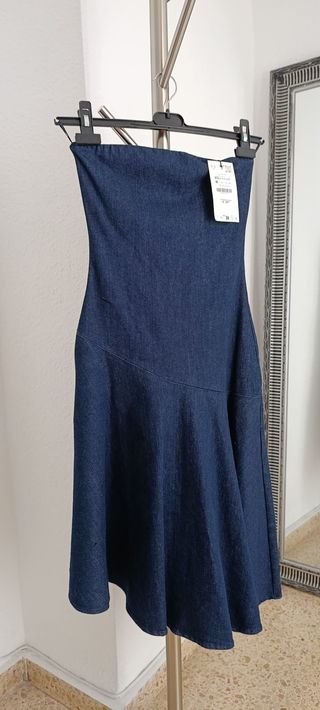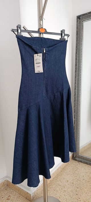 Vestido midi de ZARA. Nuevo sin estrenar y con etiqueta. Sin mangas, de hombros al descubierto o palabra de honor. Escote recto. Tejido elástico. Denim o vaquero color azul. Bajo asimétrico con volante. Cierre en espalda con cremallera y ganchito. Queda muy muy elegante. Talla XS. #vestido #denim #vaquero #zara #etiqueta #estrenar #fiesta #formal #boda #midi #largo #mini #corto #pantalones #falda #blazer #chaqueta #traje #americana #shein #primark #lefties #zapatos #top #perlas #volantes #strass #brillo #brillante #blusa #encaje #lentejuelas #bolso