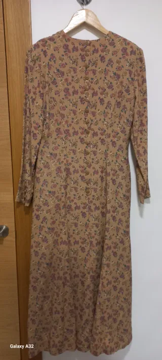 Vestido midi vintage con godets, ideal para un look retro. Lleva botonadura en espalda y mangas. SIN ESTRENAR. Boutique El corte inglés. - Diseño de manga larga. - Largo hasta los tobillos. - Estampado floral multicolor sobre fondo beige.