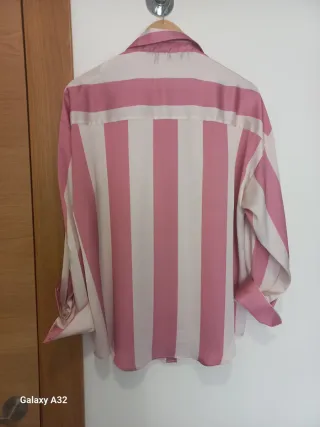 Elegante camisa de Zara con un diseño de rayas verticales en tonos rosas y beige. Confeccionada en un tejido satinado que le da un brillo sutil. Talla M. SIN ESTRENAR. - Diseño de rayas verticales. - Cuello camisero clásico. - Cierre de botones frontales dorados. - Puños con botones.