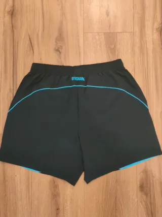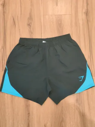 Pantalón corto deportivo Gymshark color verde azulado y azul, con detalles en contraste. - Cintura elástica. - Producto original. - Máxima comodidad. - Logo de la marca en el lateral derecho. - Sin estrenar.