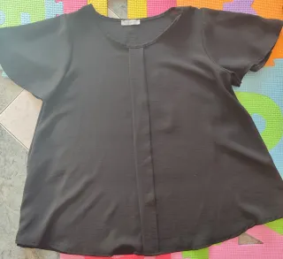 Camisa negra elegante y sin estrenar, confeccionada en 100% poliéster. - Diseño moderno con costura central. - Mangas cortas tipo mariposa. - Cuello redondo. - Talla única, equivale a una L-XL.