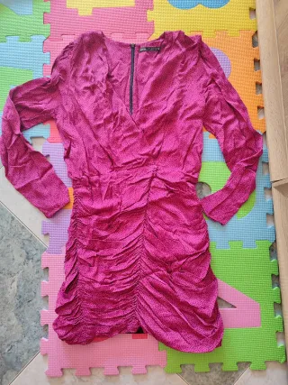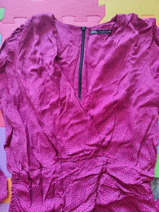 Vestido Zara talla M sin estrenar. Color buganvilla (menos rosa que en las fotos) y puntos negros. Fruncido, con gorro interior, escote cruzado y cremallera invisible en la espalda. Exterior 100% viscosa e interior 100% algodón.