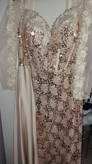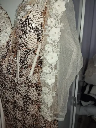 Elegante vestido de lentejuelas sin estrenar Nuevo, ideal para eventos especiales. Su diseño brillante y sofisticado te hará destacar, mangas transparentes con decoración de flores por toda la manga, todo el vestido de lentejuelas, parte del pecho decorado con diseño de flores forma corazón, vestido elegante y bonito. - Acabado con lentejuelas. - Mangas largas de tul con detalles florales.